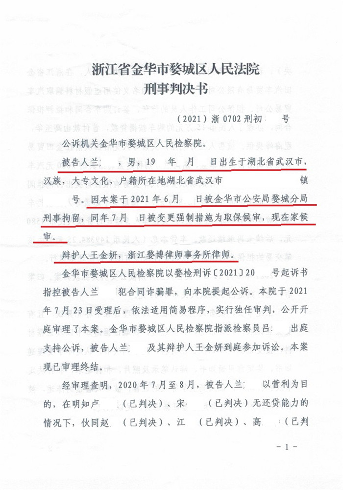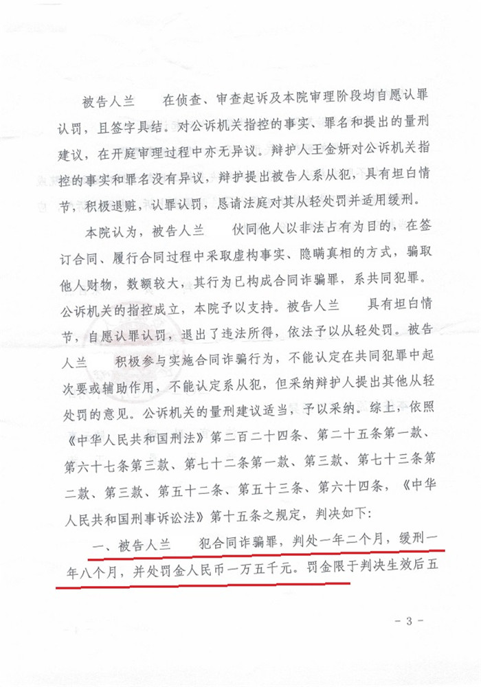 兰某合同诈骗一案判处缓刑: