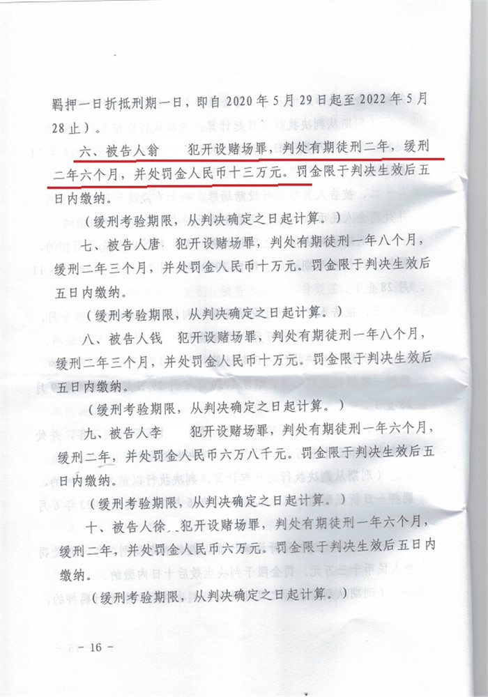 翁某开设赌场罪一案判处缓刑